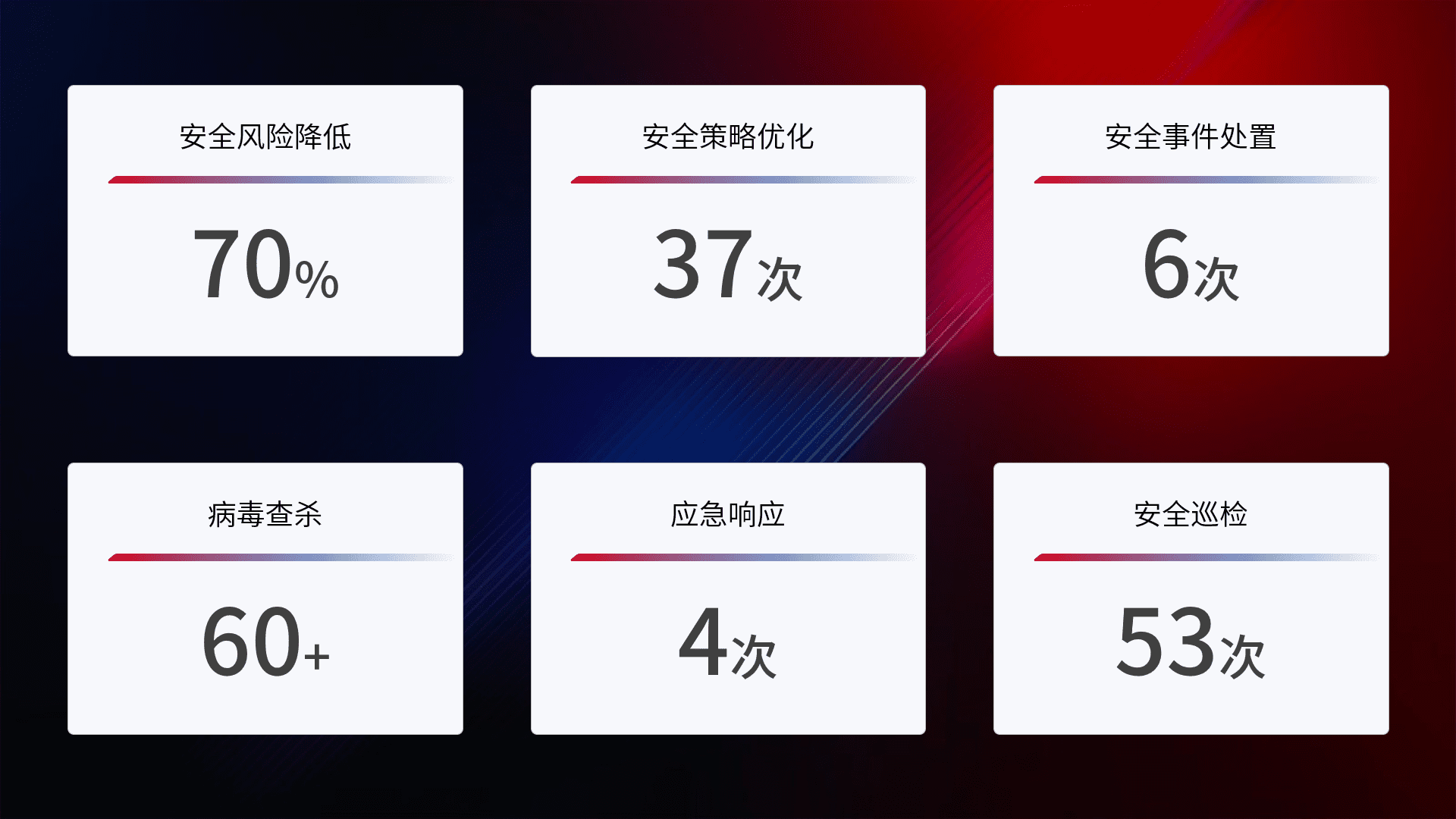 提供全面的安全事件报告体系,,包括处置报告、、、、周报、、、季度和年度总结,,结合持续监控,,,,帮助客户深入了解网络安全状况。。。。