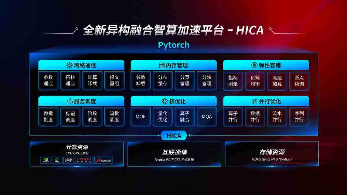 通过自研的服务层、、中间适配层、、、以及调度编排算法,,,,采用数据并行、、模型并行等多种并行方式,,把并行计算任务进行有效的分解,,,,使其分别由相应的软件栈和算力资源来承接。。。。当GPU资源变化,,HICA可以实时动态调度计算子任务并调整模型拓扑和架构,,以充分聚合各种算力资源。。
