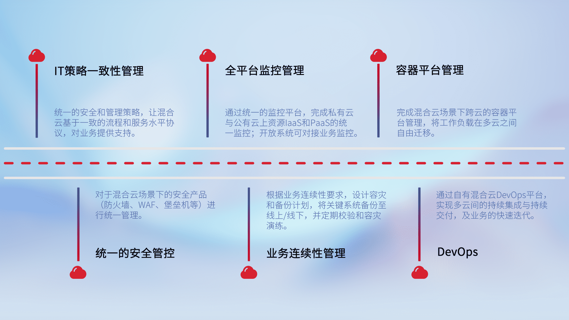 通过多云纳管,,,,以统一的资源数据模型把客户的云资源进行抽象和封装,,进而实现对多云资源的统一操作,,,,保障云资源管理的可靠性、、、稳定性与可用性。。量身定制化运维内容,,,配置、、、开发运维、、补丁管理、、、备份、、、监控、、认证和访问管理、、审计和日常巡检等,,保障在用云过程中的可靠度,,稳定度以及高可用率。。。