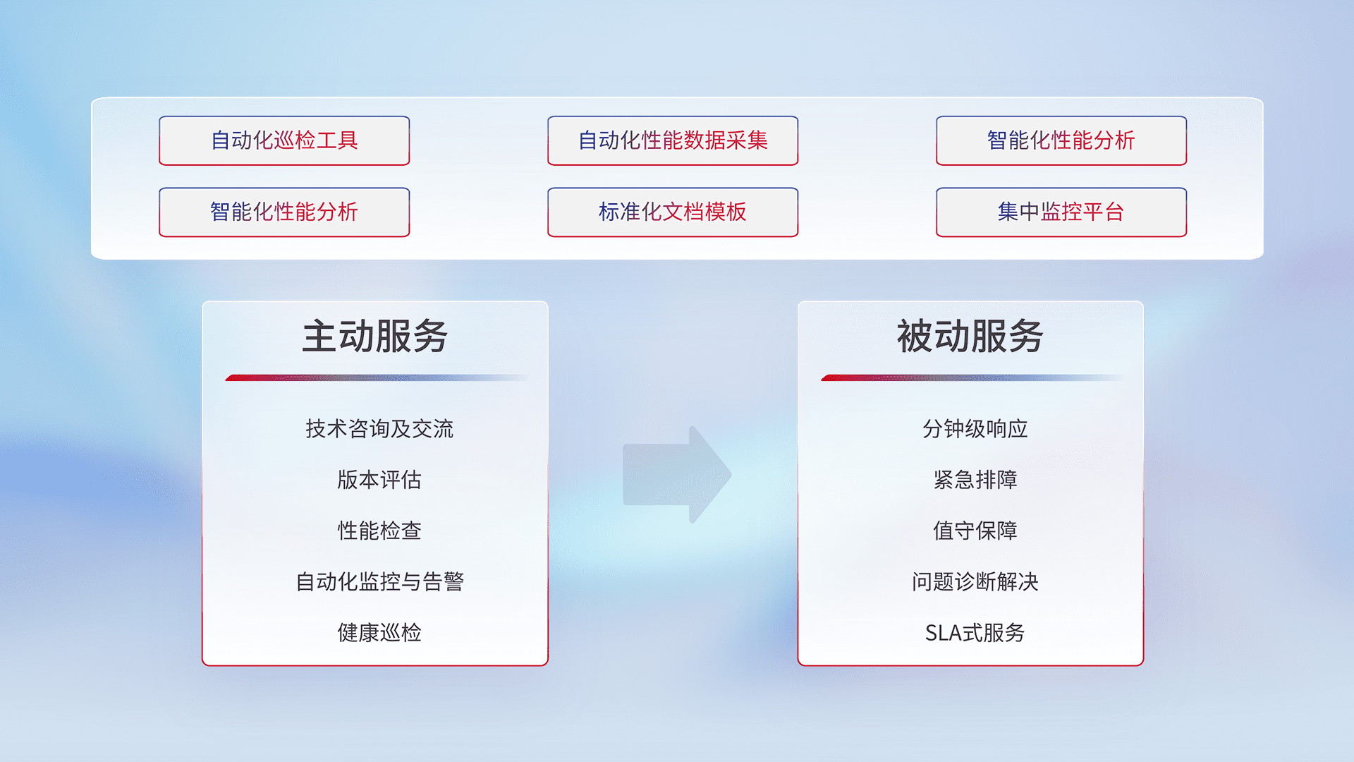 智能化工具和标准化文档,,,保障服务质量,,,,提供主动服务(包含技术咨询、、、版本评估、、性能检查、、、自动化监控与告警、、、健康巡检)和被动服务包含(分钟级响应、、、紧急排障、、、值守保障、、问题诊断解决、、SLA服务)。。